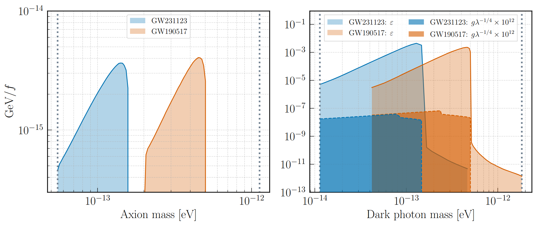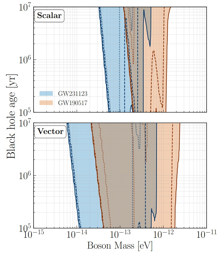 The figure on the right shows these constraints based on GW231123 and GW190517 as a function of boson mass and black hole age for both scalars (top) and vectors (bottom). Here, only a gravitational coupling is assumed.